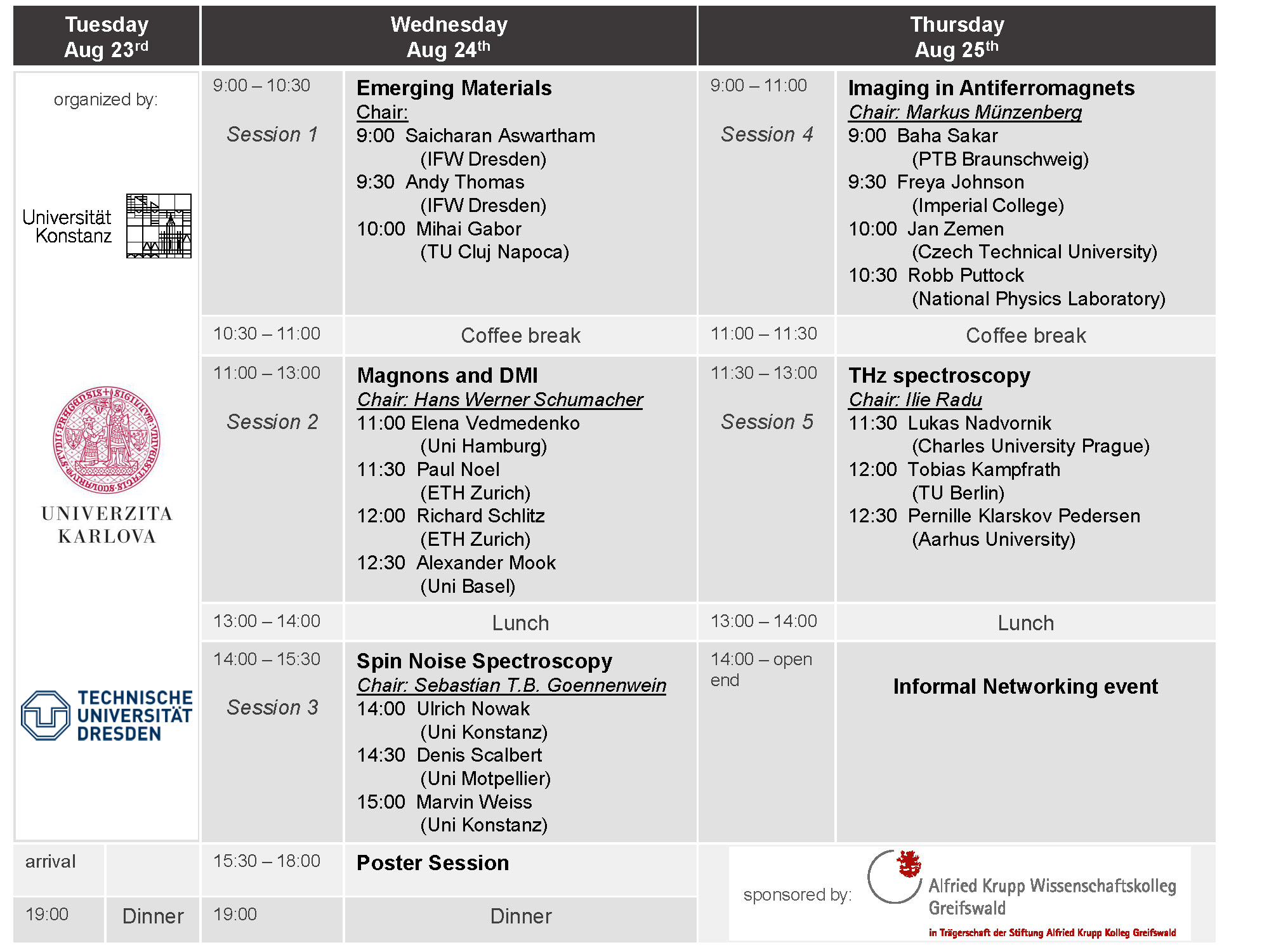 The seminar will start with a joint dinner on Tuesday August 23rd at 7pm and the scientific program ends on Thursday August 25th afternoon.