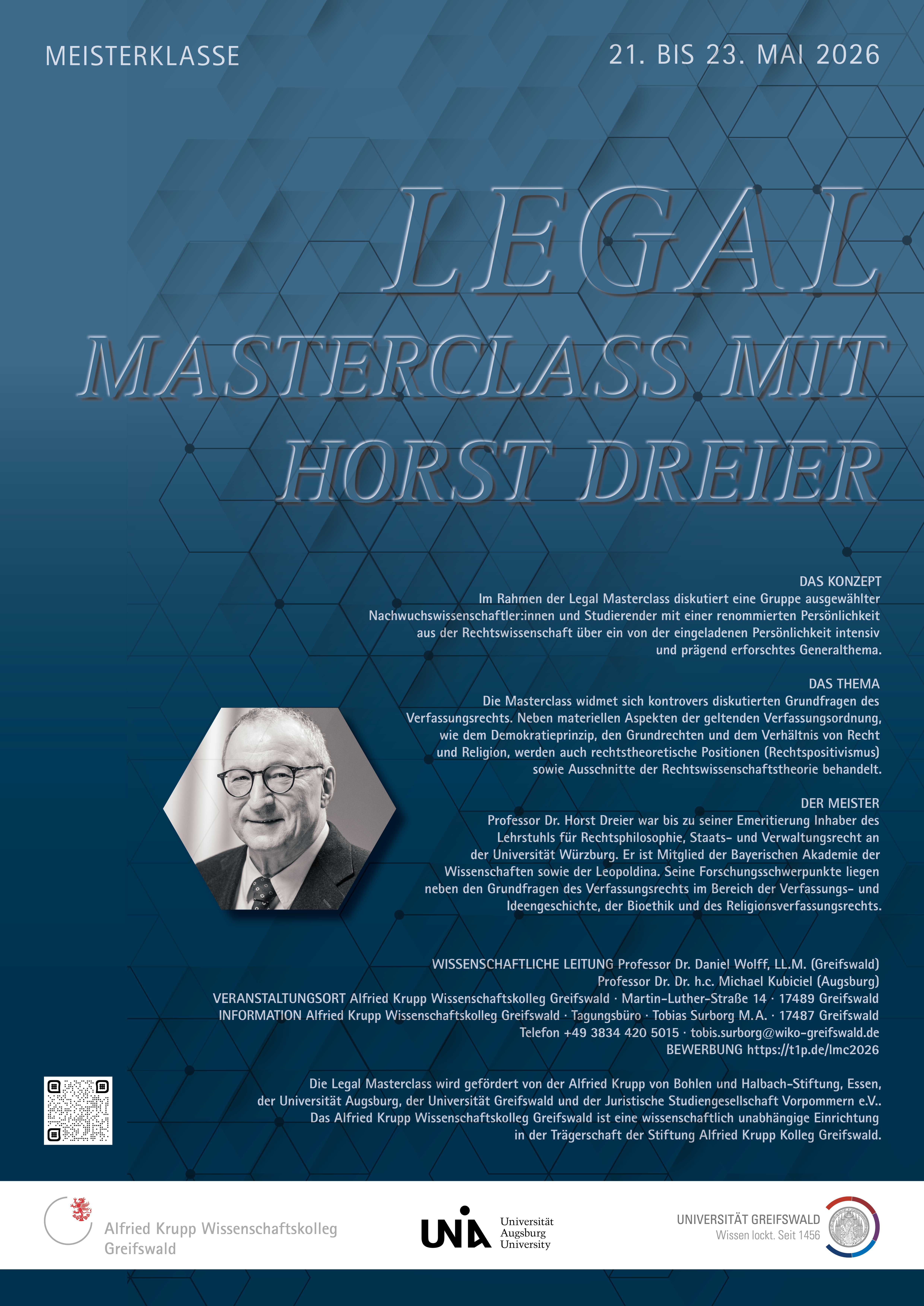 21.05.2026 - 23.05.2026 Legal Masterclass mit Horst Dreier Meisterklasse unter der wissenschaftlichen Leitung von Professor Dr. Daniel Wolff, LL.M. (Greifswald) und Professor Dr. Dr. h.c. Michael Kubiciel (Augsburg) Termin anzeigen