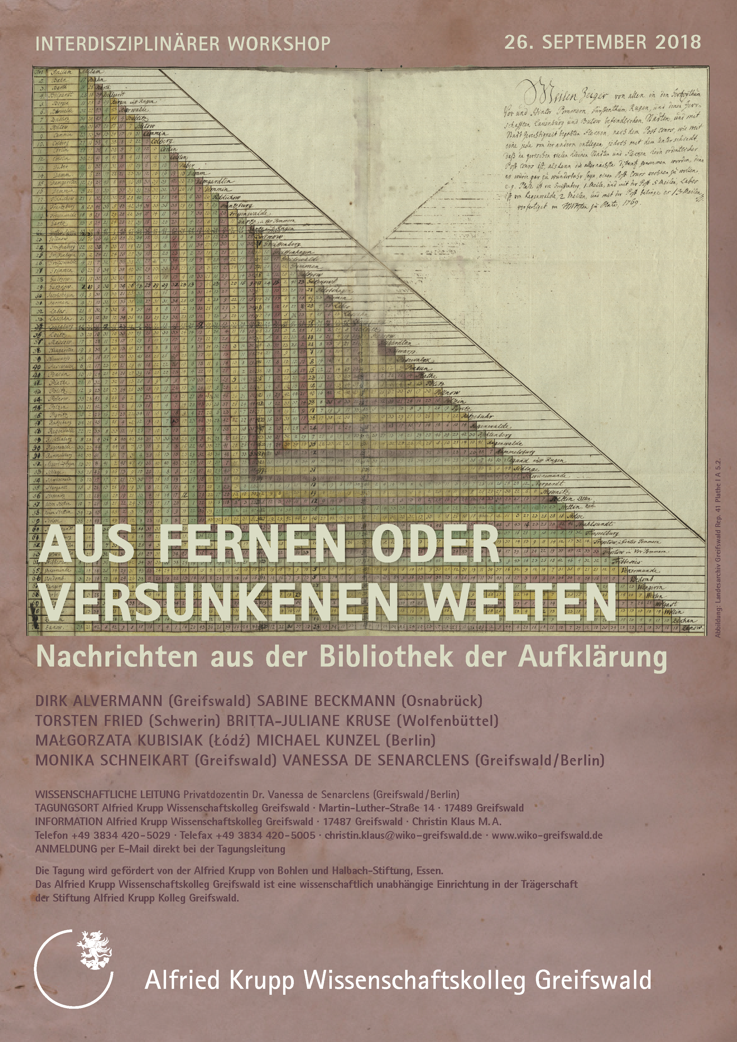 Der eintägige Workshop über Bibliotheken im 18. Jahrhundert soll Bilanz, Perspektivierung und Ausblick zugleich sein: Bilanz eines Forschungsjahrs über die Geschichte einer Sammlung, der „Bibliothek Schloss Plathe“. Diese wurde Mitte des 18. Jahrhunderts in Hinterpommern, einer entlegenen Provinz des Königsreichs Preußen, von einem Kammerherrn Friedrich des Großen gegründet. Dieses konkrete Fallbeispiel und die Wiederentdeckung eines Katalogs der Sammlung aus dem Jahr 1756 bieten Anlass, über die eklektischen Bestände solcher Bibliotheken der Aufklärung erneut nachzudenken und dabei eine global- und regionalgeschichtliche Perspektive zu entwickeln. Die Sammlungen – aber auch die Kataloge der Bibliotheken des 18. Jh. – zeugen einerseits von ihrer starken historiographischen (pommersche Quellensammlungen, Genealogien und Münzen), und geographisch-regionalen Verankerung (Karten, Meilenzeiger, Verzeichnis der pommerschen Städte etc.), andererseits von einem neuen universalistischen philosophischen Denken, das die entferntesten Ortschaften einer Provinz über einen regen Briefaustausch mit Akteuren der Kulturzentren verbindet. Manuskripte religionskritischer Texte zirkulieren beispielweise unter dem Mantel der Vertraulichkeit und finden ihren Platz in den Regalen der Bibliotheken neben Leichenpredigten pommerscher Persönlichkeiten und Bibelsammlungen in Plattdeutsch. Der Titel des Workshops – „Aus fernen oder versunkenen Welten: Nachrichten aus den Bibliotheken der Aufklärung“ – lässt zwei Hauptausrichtungen der Bibliothek als Wissensort anklingen, die es mit Blick auf die zukünftige Forschung zu diesem Thema in ihrer Gleichzeitigkeit und Kongruenz zu verstehen gilt: Eine horizontale, die von Universalismus und Neugier auf das Unbekannte geprägt ist, sowie eine vertikale, die die Verbundenheit mit einem Ort, seiner Region und seiner Geschichte betont.