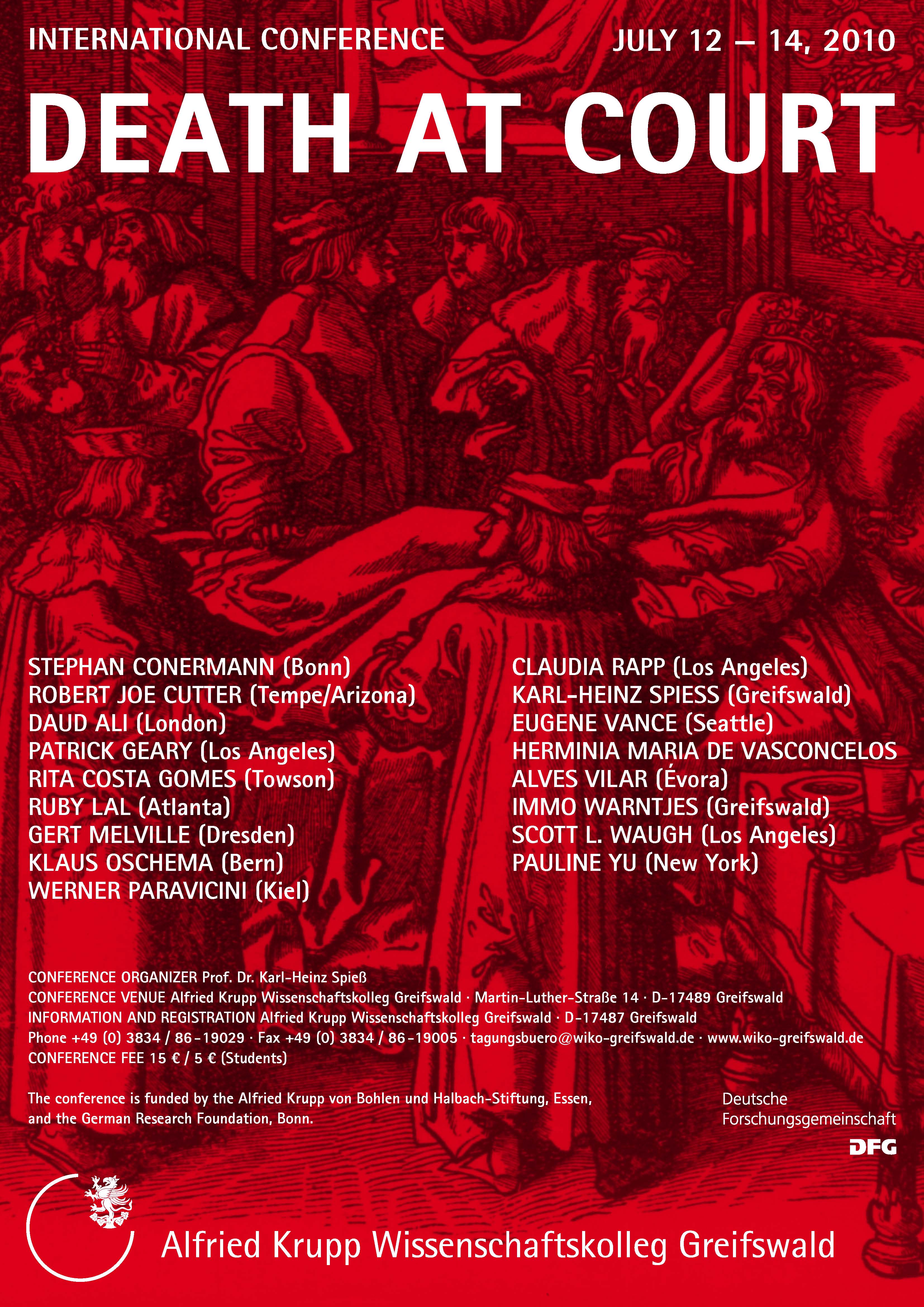 The upcoming conference, for its part, is not only concerned with a comparative approach to European court culture, but aims at a more global perspective. Thus, it continues the work of the Court Culture Group, which was very recently founded almost exclusively by American scholars, but which can since claim a worldwide membership. A volume of conference proceedings (‘Rhetoric and the Discourses of Power in Court Culture: China, Europe and Japan’) has been published in 2005 as part of this work and a second conference was organized in Coburg in 2006, entitled ‘Courts as Symbolic Systems and Forms of Communication’.
