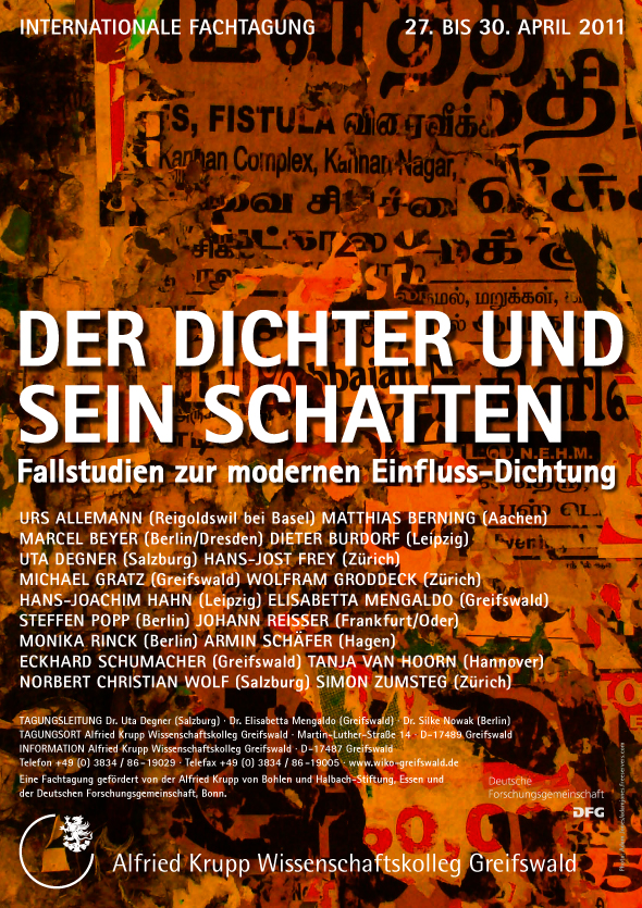 Die Tagung möchte das Phänomen der Einfluss-Lust (und nicht nur der „Einfluss-Angst“, mit der sich die wirkungsmächtige Studie von Harald Bloom auseinandergesetzt hat) unter der Perspektive ihrer Produktivität neu bewerten. Die Grundannahme ist, dass die Auseinandersetzung mit anderen DichterInnen und ihrer Sprache für die Entstehung einer eigenen Poetik konstitutiv ist. Dies gilt insbesondere für moderne Lyrik, in der im zwanzigsten Jahrhundert Formen wie Zitation und Montage, literarische ‚ready mades‘ und andere affirmative Formen von Intertextualität (bis zum Extremfall des Plagiats) ihre literarische Blüte erleben und aus dem Schatten des Trivialen treten. Das Verhältnis von Originalität und Epigonentum wird komplexer als bisher zu beschreiben sein.