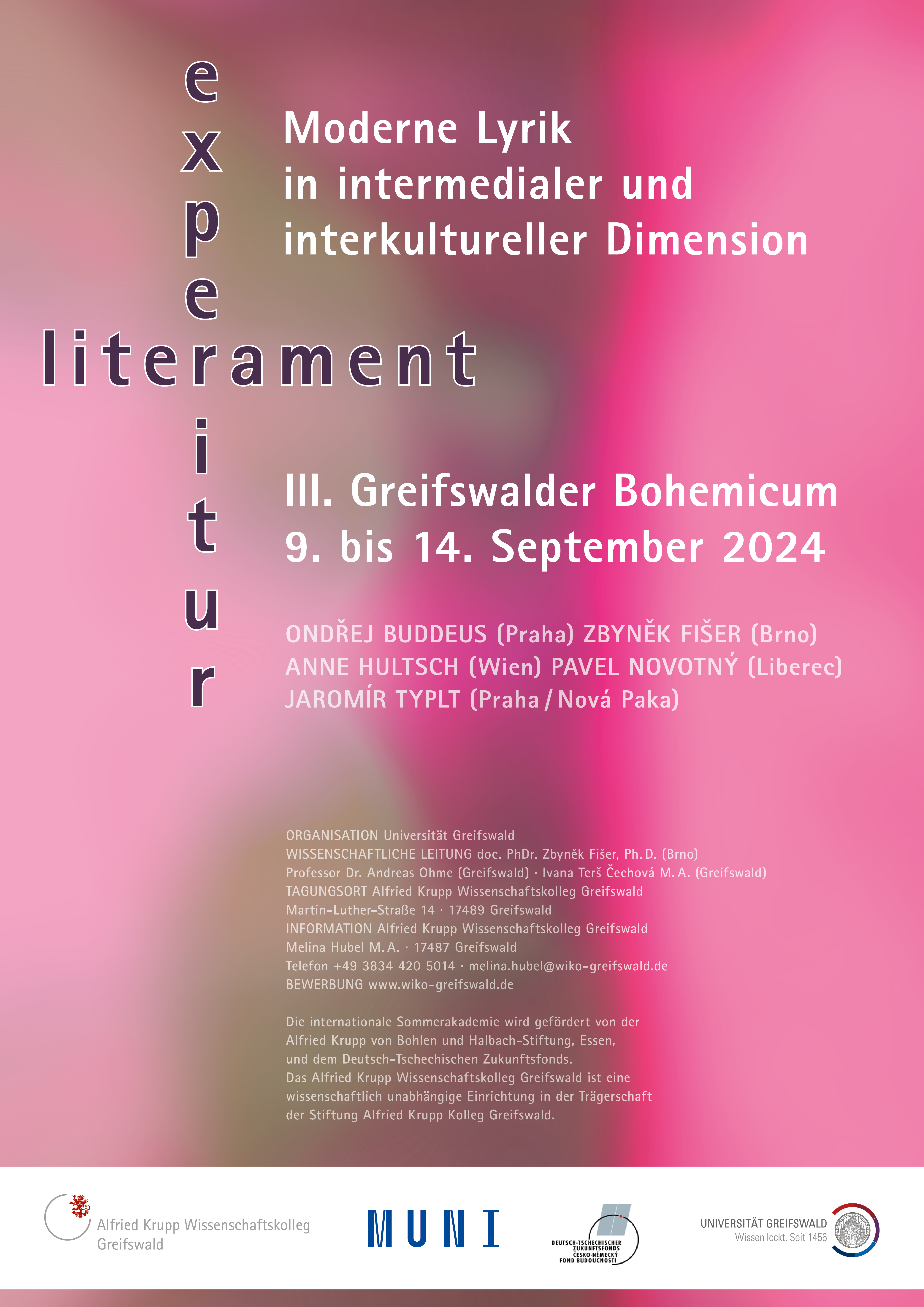 Das Greifswalder Bohemicum, dieses Jahr zum Thema EXPERIMENT und LITERATUR in der Lyrik, ist eine einwöchige internationale Sommerschule der Universität Greifswald und des Alfried Krupp Wissenschaftskollegs Greifswald zur Literatur und Sprache Tschechiens. Mit Fachseminaren und Abendvorträgen von international renommierten Forschenden in deutscher und tschechischer Sprache bietet das Greifswalder Bohemicum die Möglichkeit, die tschechische Kultur in ihrer Vielfalt und Spezifik intensiv kennenzulernen.