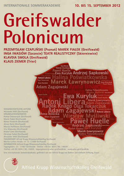 Das Greifswalder Polonicum ist eine seit 2011 stattfindende Sommerschule zur polnischen Kultur, Literatur und Sprache, die von international hochrangigen Polonisten gestaltet wird und an fortgeschrittene Studierende der Polonistik aus aller Welt gerichtet ist. Analog zum seit vielen Jahren sehr gut etablierten Greifswalder Ukrainicum erhalten die Teilnehmer beste Voraussetzungen, um sich auf wissenschaftlicher Ebene mit Sachverhalten zeitgenössischer polnischer Literatur und den Wandlungsprozessen der polnischen Kultur auseinanderzusetzen. Wir betrachten die Verbindung dieser zwei Bereiche unter der Kategorie der zivilgesellschaftlichen Umbrüche als zentrales Element der Sommerschule und runden das Programm durch öffentliche Abendvorträge, die auch politische und geschichtliche Kontexte einbeziehen, ab.Das Polonicum stellt auch eine Ergänzung und Erweiterung des universitären Polonicums der Ernst-Moritz-Arndt-Universität Greifswald dar, einer Zusatzqualifikation für Sprachpraxis, Literatur-, Sprach- und Kulturwissenschaft, die sich über zwei Semester erstreckt.