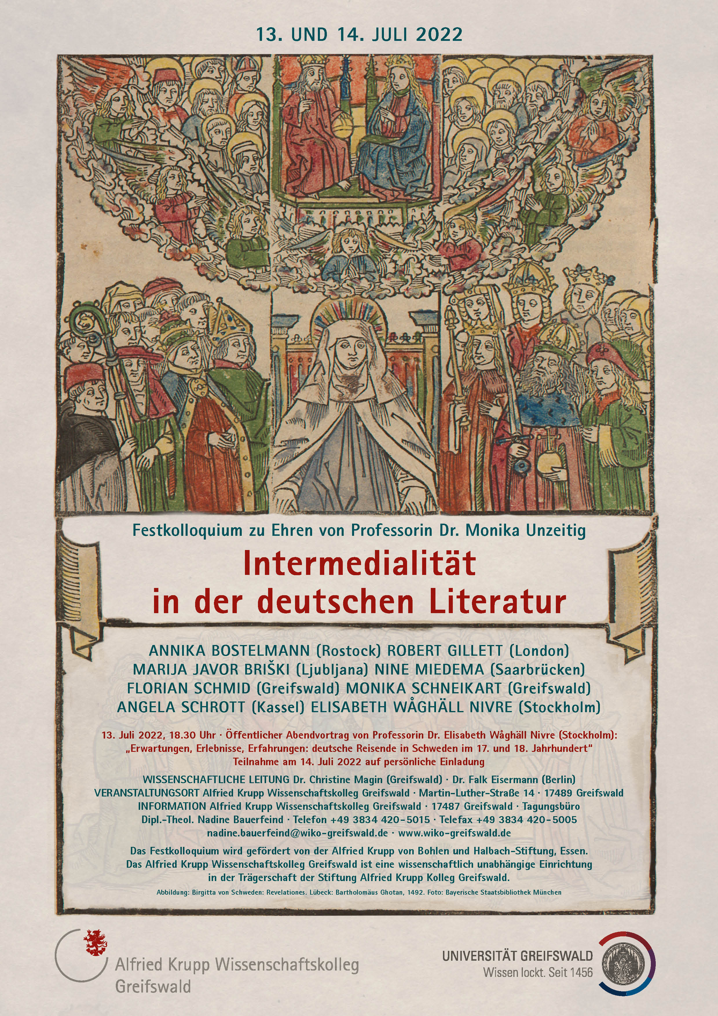 Zum Ende des Sommersemesters 2022 wird Frau Professorin Dr. Monika Unzeitig, seit 2008 Inhaberin des Lehrstuhls für Ältere deutsche Sprache und Literatur, die Universität Greifswald verlassen und in den Ruhestand eintreten. Aus diesem Anlass sollen ihre besonderen Verdienste um die Universität sowie ihre weitgespannten, von internationaler Vernetzung wie von regionaler Schwerpunktsetzung geprägten Forschungsinteressen im Rahmen des Festkolloquiums gewürdigt werden. Das Thema „Intermedialität in der deutschen Literatur“ reflektiert das breite fachliche Profil von Monika Unzeitig. Einige ihrer Forschungssschwerpunkte – Reiseliteratur, Historische Dialogforschung, Buch- und Bibliotheksgeschichte – werden in diesem Zusammenhang von wissenschaftlichen Weggefährt*innen und Mitarbeiter*innen präsentiert und diskutiert.