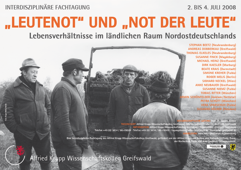 „Leutenot“, wie der Mangel an Arbeitskräften gewöhnlich genannt wurde, war eines der zentralen Probleme der ländlichen Regionen in Ostelbien während der zweiten Hälfte des 19. Jahrhunderts. Verursacht wurde die „Leutenot“ durch die Auswanderung nach Übersee, durch die Abwanderung in die Städtemit ihren neu entstehenden industriellen Arbeitsmöglichkeiten und durch die Veränderung der Wirtschaftsstrukturen auf dem Lande selbst.Wie es um die „Not der Leute“ in Nordostdeutschland bestellt war und heute noch ist, soll die Tagung aus der Perspektive unterschiedlicher Disziplinen beleuchten. Aktuelle Forschungsergebnisse zu prekären Lebenslagen im ländlichen Raum Ostvorpommerns werden eine interdisziplinäre Diskussion der Lebensverhältnisse sowie der Chancen und Restriktionen der Lebensführung in sozialen Räumen ermöglichen, deren Bevölkerung schrumpft. Historiker, Soziologen, Sozialgeographen, Sozial-, Kultur- und Geisteswissenschaftler sowie Praktiker und die interessierte Öffentlichkeit aus der Region sind herzlich dazu eingeladen, die Entwicklung der Lebensverhältnisse in Ostvorpommern seit den großen Untersuchungen, nach den Zäsuren des letzten Jahrhunderts und im Hinblick auf zukünftige Entwicklungen zu diskutieren.
