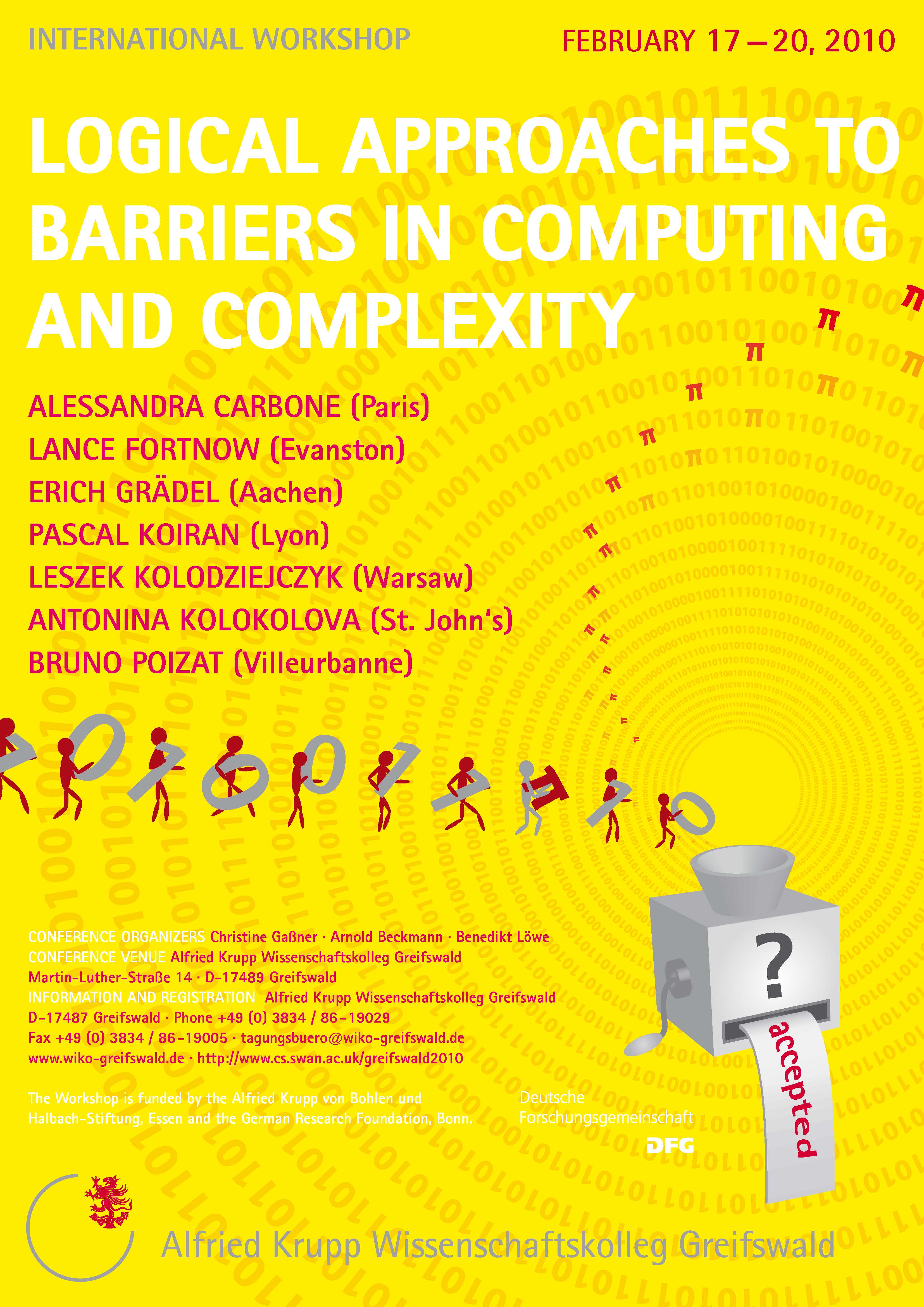 In our workshop, we shall focus on the following aspects: logical descriptions of complexity (e.g., descriptive complexity, bounded arithmetic), complexity classes of abstract, algebraic and infinite structures, barriers in proving complexity results, and Kolmogorov complexity and randomness. Descriptive complexity and bounded arithmetic are two complementary approaches to describe computational complexity in logical terms. The former is focussed on decision problems, while the latter is more concerned with search problems. Both environments render questions about complexity classes in a natural way, leading to important open problems in their areas (e.g. finding logics to capture certain complexity classes, or the separation problem for bounded arithmetic).