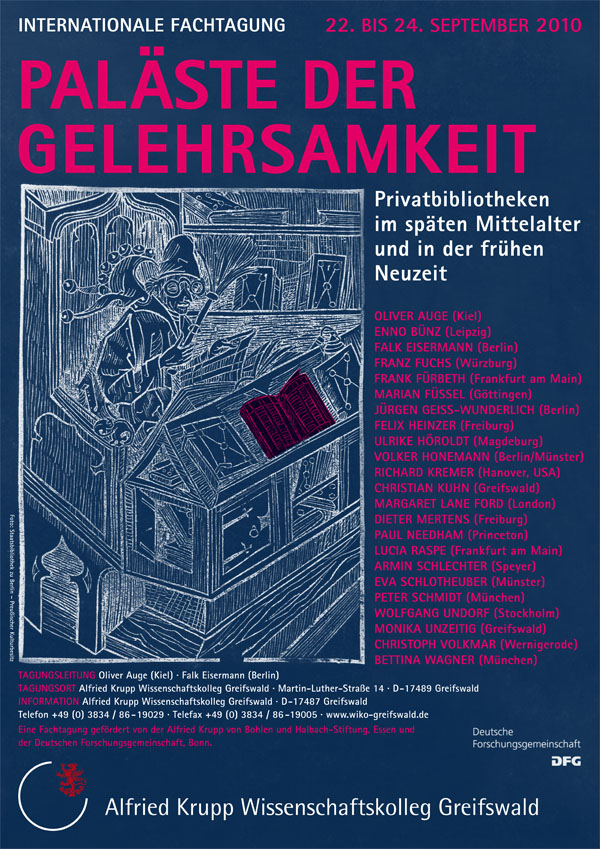 Die Tagung möchte einen vertieften Zugang zur Geschichte dieser „Paläste der Gelehrsamkeit“ eröffnen. Thematisiert werden sollen einerseits die Qualität und Quantität der verschiedenen Typen privater Bibliotheken, andererseits die spezifischen Bedingungen ihrer Überlieferung und ihres Erhalts. Ebenso im Zentrum steht die Frage nach dem Nutzen der Untersuchung privater historischer Buchbestände für die moderne Wissenschaft.