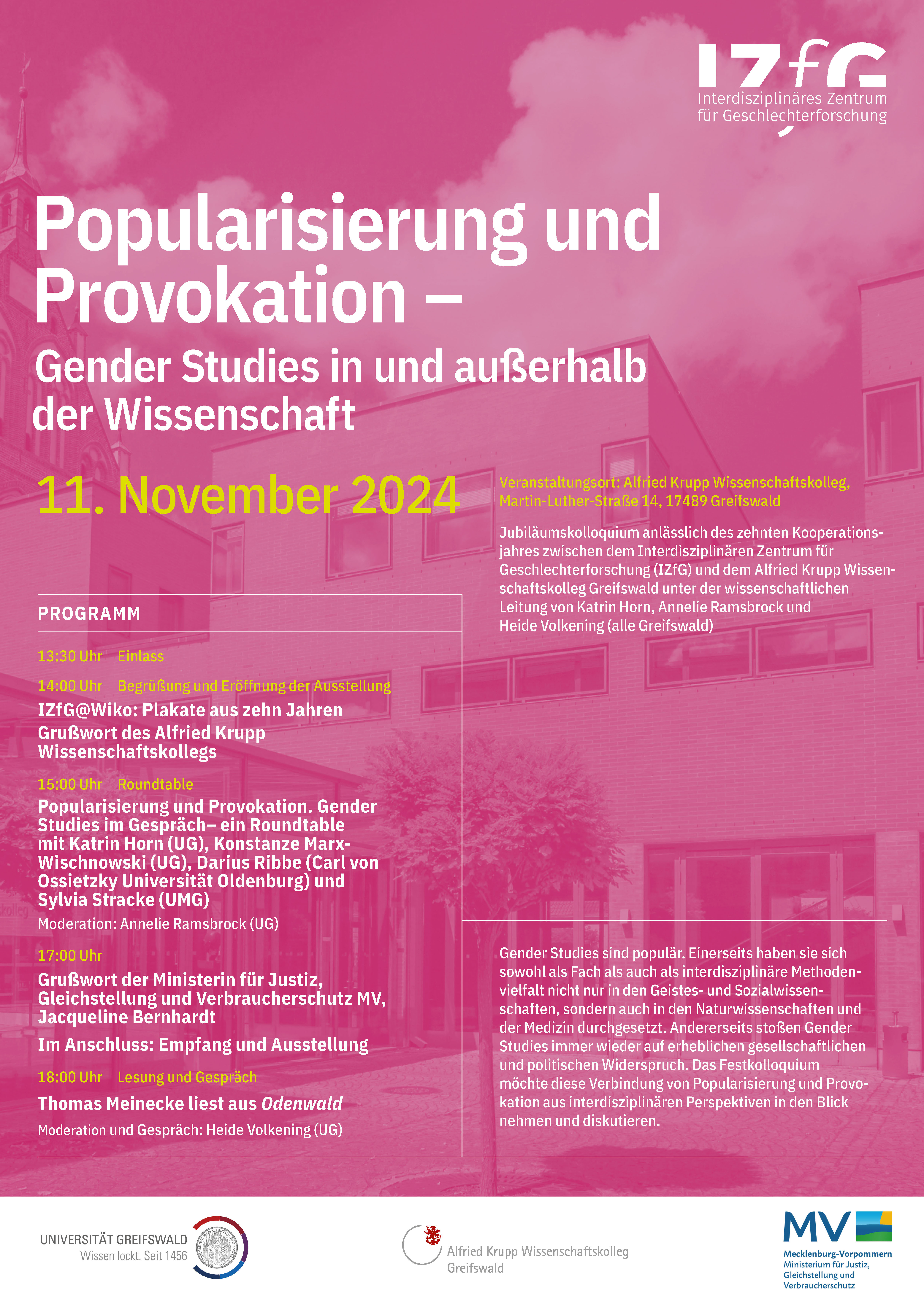 Gender Studies sind populär. Einerseits haben sie sich sowohl als Fach als auch als interdisziplinäre Methodenvielfalt nicht nur in den Geistes- und Sozialwissenschaften, sondern auch in den Naturwissenschaften und der Medizin durchgesetzt. Inhalte, Methoden und Ergebnisse der Geschlechterforschung werden auch außerhalb wissenschaftlicher Diskurse breit rezipiert, und popularisiert. Sie finden Eingang in gesellschaftliche und künstlerische Prozesse sowie politische und medizinische Praktiken. Sie sind wichtige Bezugspunkte für Handlungsempfehlungen in Forschung und Wissenschaft. Andererseits stoßen Forschungen der Gender Studies immer wieder auf erheblichen gesellschaftlichen und politischen Widerspruch. Das vorgeschlagene Festkolloquium möchte aus interdisziplinären Perspektiven der Gender Studies diese Verbindung von Popularisierung und Provokation in den Blick nehmen und diskutieren.