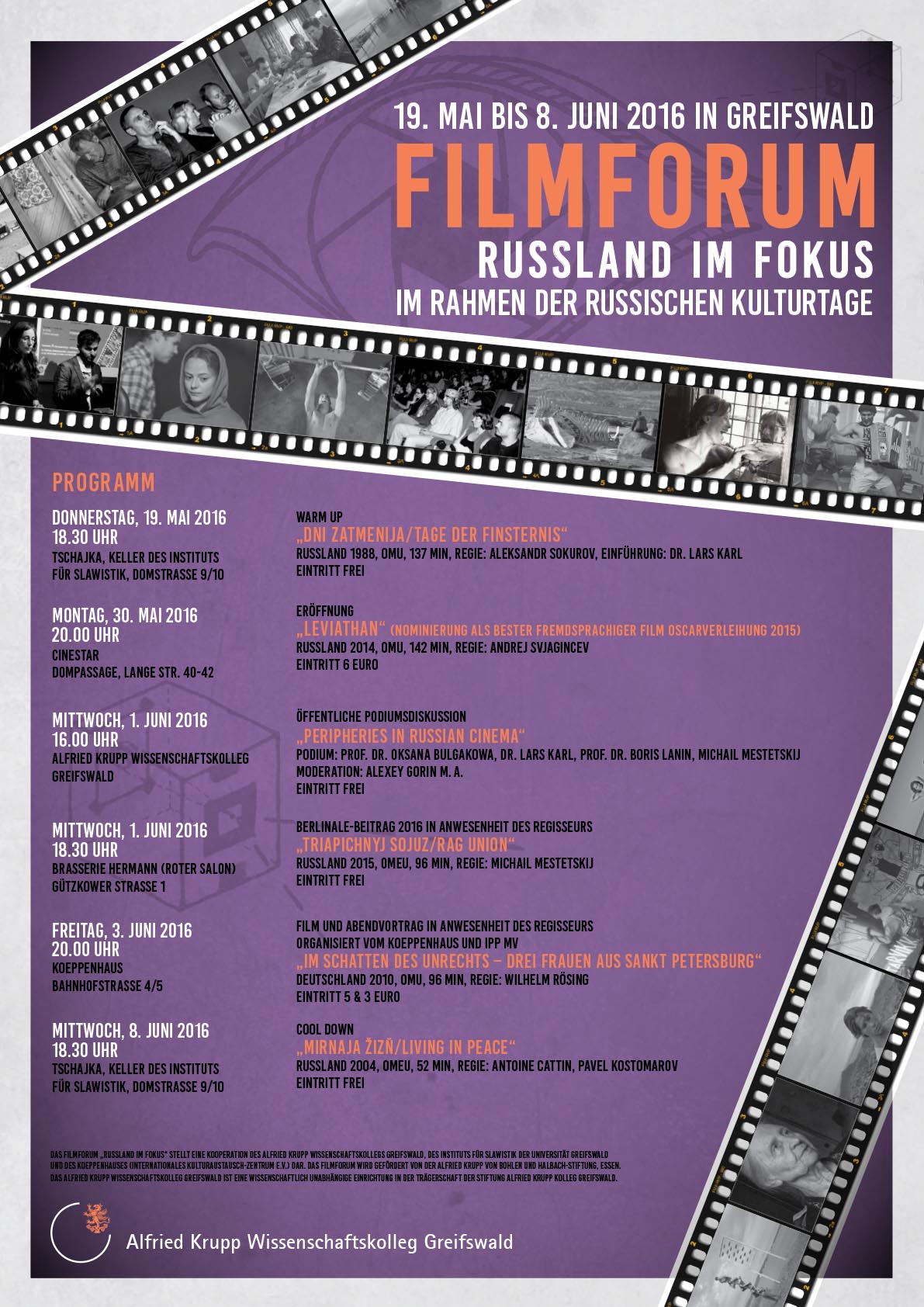 Das Alfried Krupp Wissenschaftskolleg Greifswald und das Institut für Slawistik organisieren im Rahmen des Greifswalder Filmforums eine Reihe von cineastischen Veranstaltungen, die Filme aus und über Russland in den Fokus nehmen. Im Programm sind sowohl aktuelle wie auch historische Spiel- und Dokumentarfilme, die unter dem Titel „Peripherien“ gebündelt werden. Dabei geht es um russische Peripherien unterschiedlicher Dimensionen – geographische, gesellschaftliche wie auch psychosoziale. Ziel ist es, Russlands Peripherien und Provinzen in den Blick zu nehmen und über die Metropolen Moskau und St. Petersburg hinaus ein anderes, vielfältiges Russlandbild zu zeigen. Das Greifswalder Filmforum 2016 ist eingebunden in das Programm der Russischen Kulturtage.