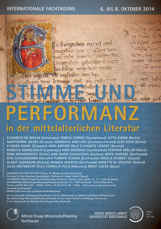 Die Tagung setzt die Reihe von mediävistisch interdisziplinären Kolloquien zu mittelalterlichen Redeszenen fort: 2005 fand in Münster die Tagung zu „Formen und Funktionen von Redeszenen in der mittelhochdeutschen Großepik“ statt. 2007 folgte das Bremer Kolloquium „Redeszenen in der mittelalterlichen Großepik: komparatistische Perspektiven“. Mit der Tagung zum Thema „Sprechen mit Gott“ (Mülheim an der Ruhr, 2009) war die Perspektive auf Redeszenen in der geistlichen Erzähldichtung gerichtet. Die Vielstimmigkeit in mittelalterlichen Texten unterschiedlicher Sprach- und Kulturräume, ihre graphische Codierung in Handschriften und ihre medial mündliche Vermittlung sind Thema dieser Tagung in Greifswald. Über Klang, Rhythmus, Reime und Stil erzeugt der laute Vortrag eine über das Ohr vermittelte Textrezeption. Der literarische Text, aber auch Hinweise zur Performanz in der handschriftlichen Überlieferung und die Stimme des Vortragenden konstituieren die poetische Qualität des Textes und haben Anteil an seiner Sinngebung: Wie lässt der Vortrag den Text zum Sprechkunstwerk werden? Wie macht er seine eingeschriebene Mündlichkeit hörbar? Und inwiefern ergeben sich mit der Stimme des Vortragenden in der Vergegenwärtigung des Textes (vereindeutigende oder öffnende) Interpretation und Autorisierung? Über die Auseinandersetzung mit Phänomenen und Effekten von Stimme und Performanz schreiben ausgewiesene ExpertInnen und NachwuchswissenschaftlerInnen das Wissen über mittelalterliche Redeszenen fort.