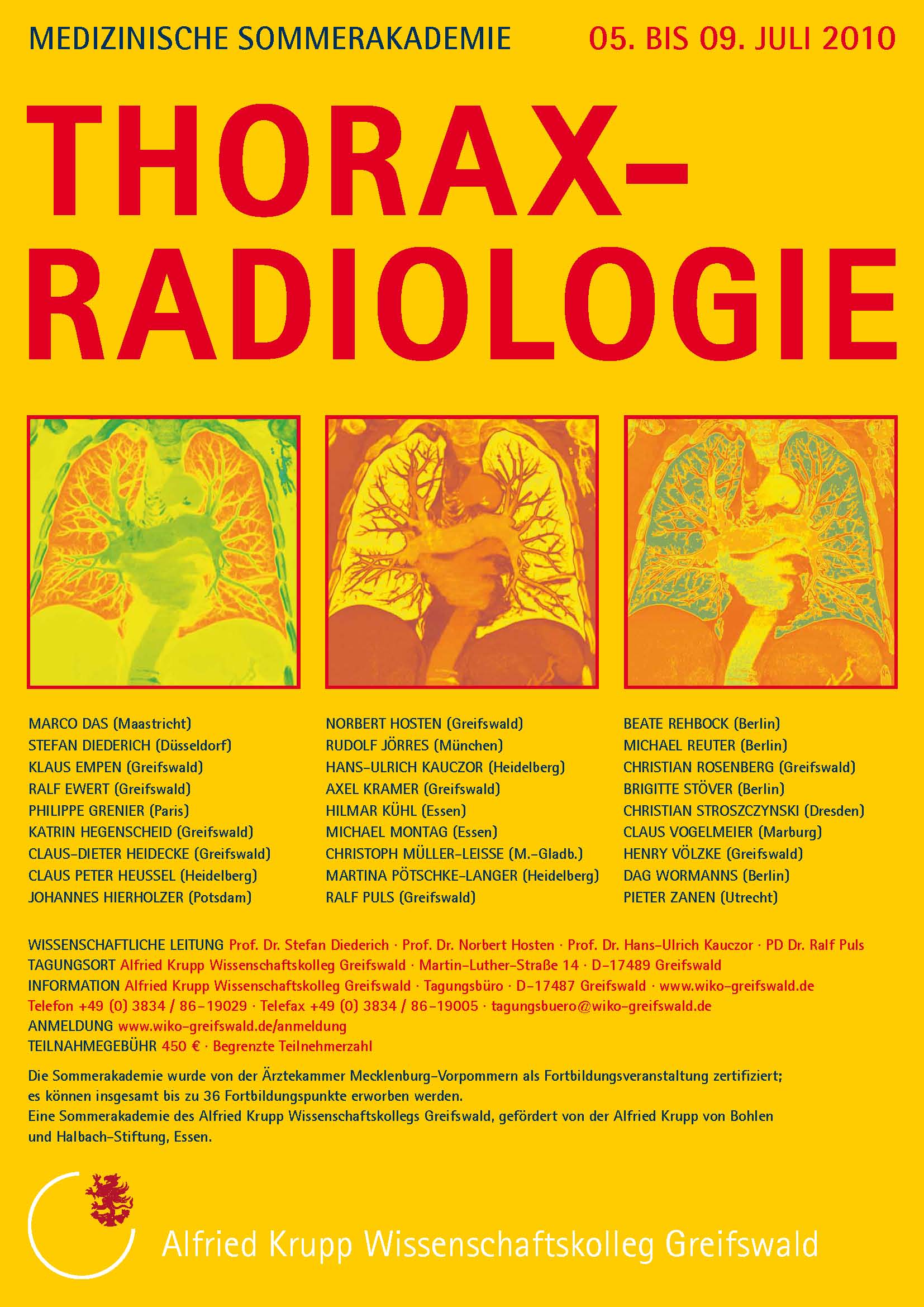 Im Mittelpunkt stehen diejenigen Indikationen und Untersuchungsverfahren, die besonders häufig durch bildgebende Diagnostik abgeklärt werden, vor allem HRCT, Infektionen, Lungentumore, extrapulmonale Erkrankungen und interventionelle Radiologie. Spezielle Untersuchungstechniken und Alltagsaspekte werden von ausgewiesenen Referenten erläutert. In den Hands-on-Workshops diskutieren Teilnehmer, Vortragende und Mitarbeiter das praktische Vorgehen. Die Referenten stellen eine umfangreiche Bildsammlung zur Verfügung. Vertreter der klinischen Fächer stehen zur interdisziplinären Diskussion bereit.