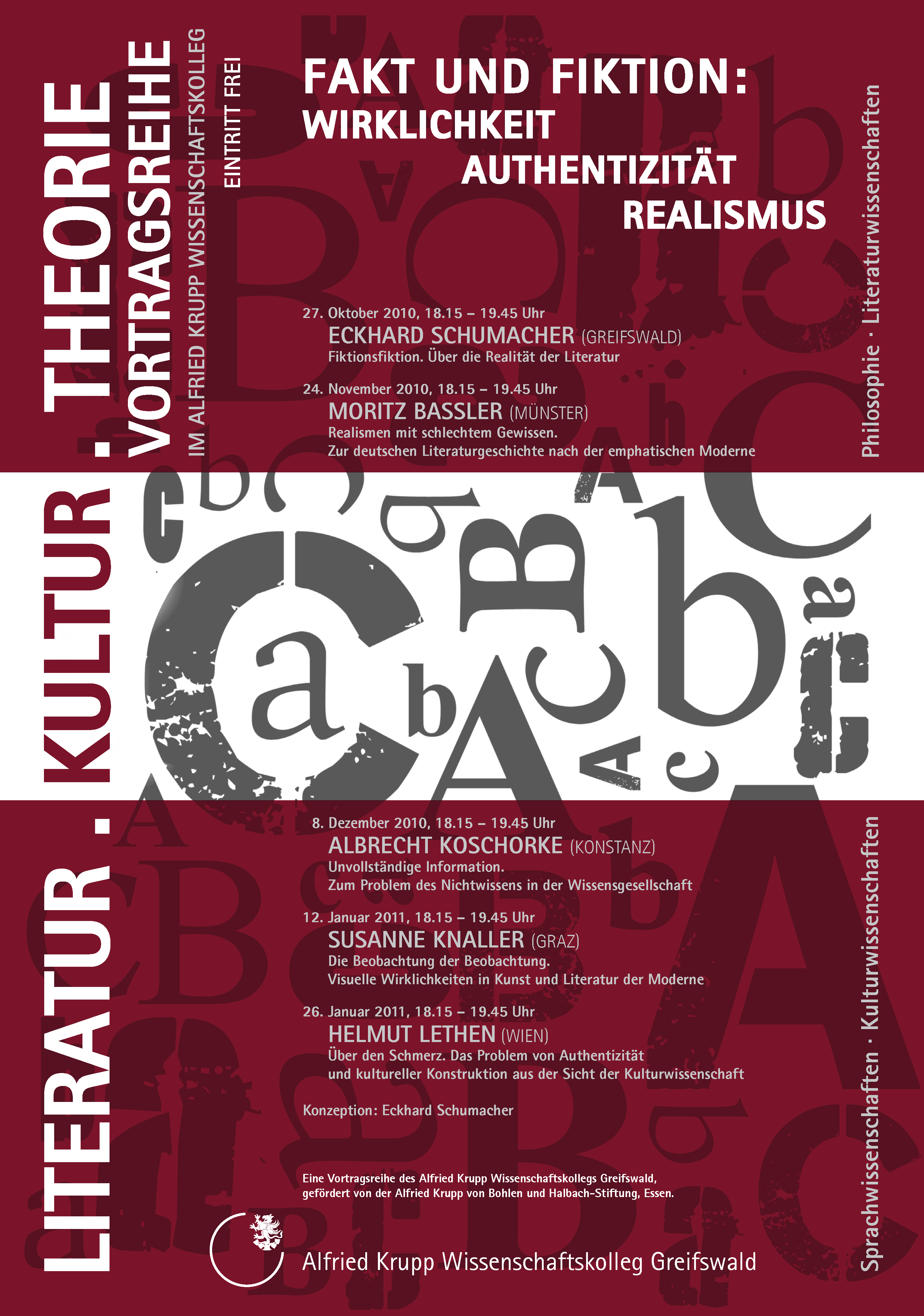 Die Vortragsreihe wird einige dieser Verunsicherungen in den Blick nehmen und sie vor dem Hintergrund gegenwärtiger literatur- und kulturwissenschaftlicher Ansätze zur Diskussion stellen: Wie reagieren Literatur und Kunst auf eine Wirklichkeit, die selbst schon als Fiktion begriffen wird? Welche Konsequenzen ergeben sich für das Verständnis von Realität, wenn nicht eindeutig zwischen Fakt und Fiktion zu unterscheiden ist? Was passiert, wenn man dennoch an dieser Unterscheidung festhält? Und was genau tut man eigentlich, wenn man heute – mit Blick auf die Realismen des 19. und 20. Jahrhunderts – von Realismus spricht?