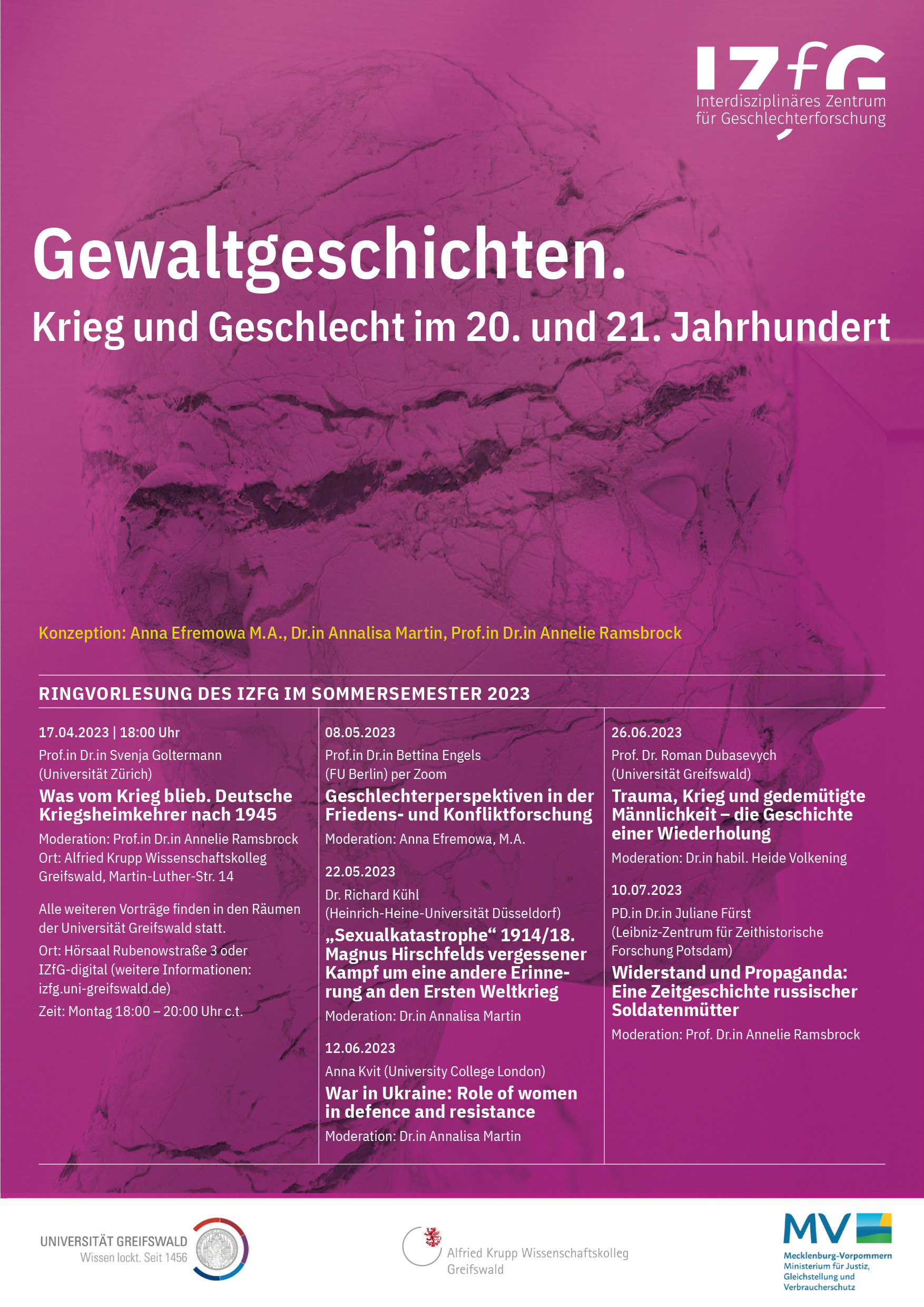 Aus Anlass der aktuellen Diskussion verweist die Ringvorlesung auf weitere Szenarien der Verschiebung von Geschlecht und sozialen Rollen in Vorkriegs-, Kriegs- und Nachkriegszeiten des 20. und 21. Jahrhunderts, wobei Geschlechterfragen im Alltag des Ausnahmezustands eine besondere Bedeutung zukommt. Dabei findet auch die Rolle von sexualisierter Gewalt im Krieg sowie das Verhältnis von Queerness und Kriegserfahrungen in der Vortragsreihe Beachtung. Die Reihe ist interdisziplinär angelegt und präsentiert verschiedenartige Schauplätze kriegsbedingter Ausnahmezustände. Die Vorträge befassen sich mit den Erfahrungen an der Front und Heimatfront, mit Inhalten von Propaganda und Aufarbeitung und mit geschlechtsspezifischen Erinnerungen und ihrer Verarbeitung in der Kunst und Literatur.