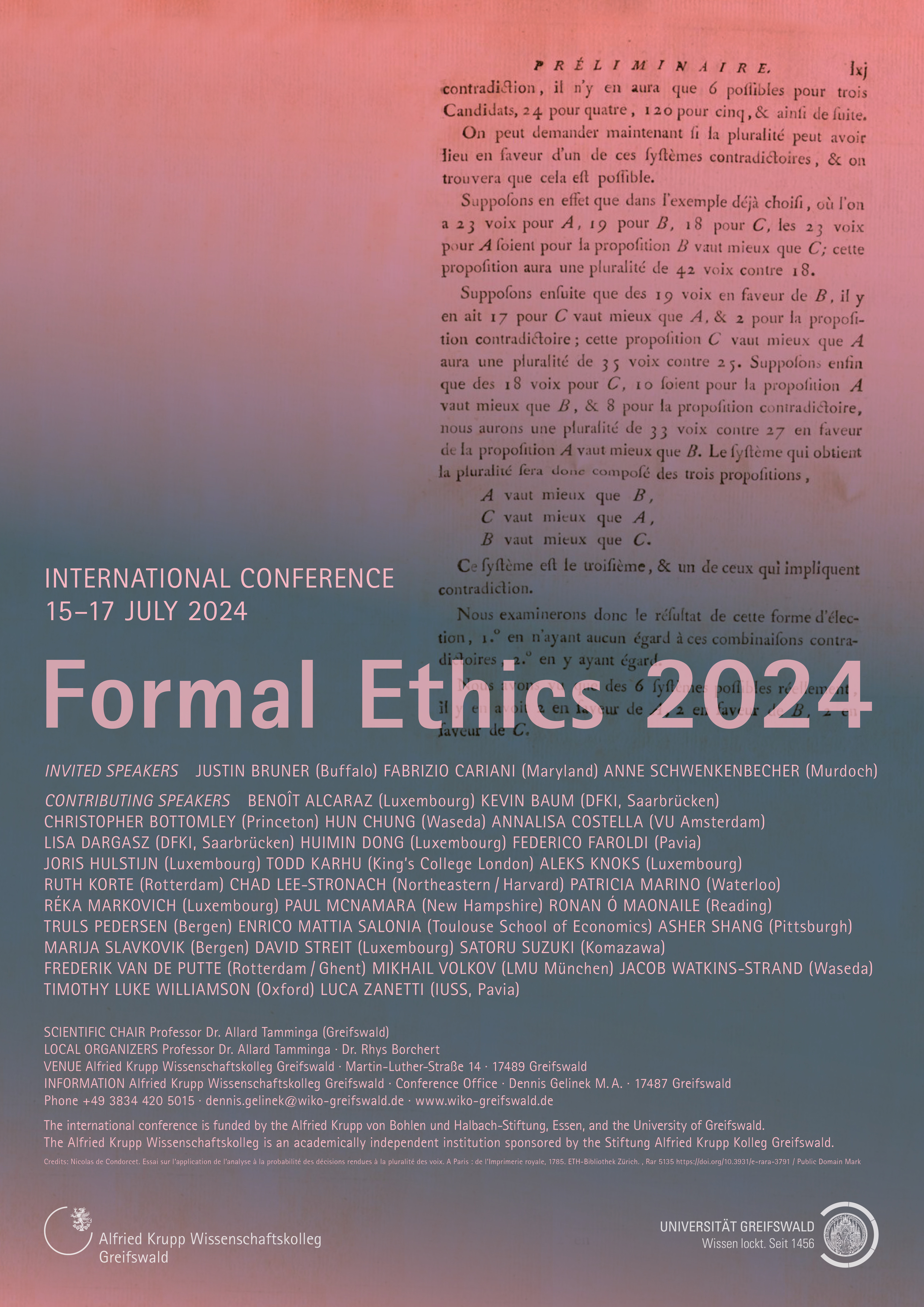 “Formal Ethics” is a common denominator for the application of tools from logic, decision theory, game theory, and social choice theory to the analysis of concepts and theories in moral and political philosophy. It is a rapidly growing field of research that goes back to the work of Kenneth Arrow, Amartya Sen, John Harsanyi, Georg Henrik von Wright, and others. The field has recently gained new impetus with formal work on freedom and responsibility, welfare economics and population ethics, deontic logic and natural language semantics, value theory, and the evolution of norms and conventions.