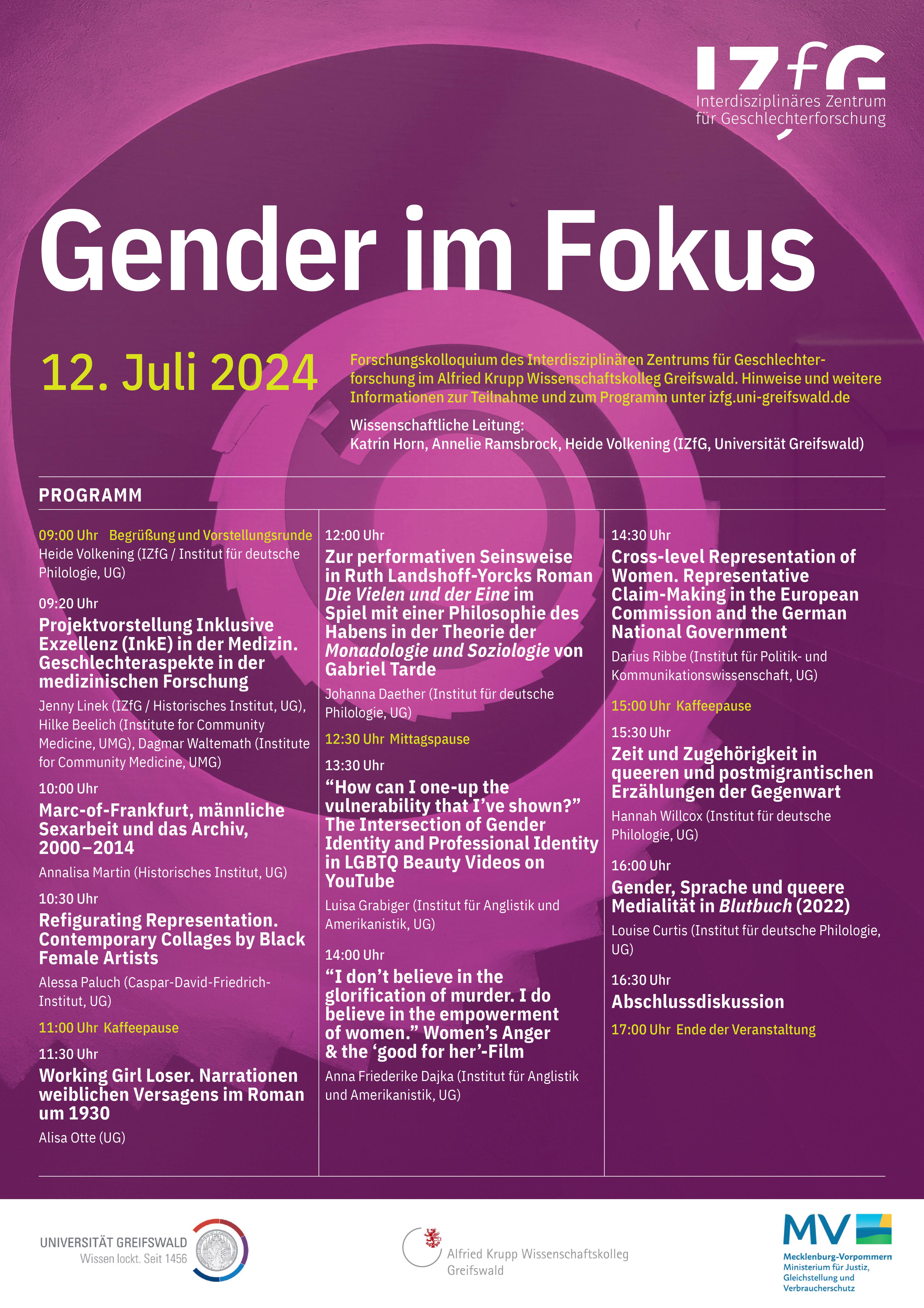 Das Kolloquium richtet sich an alle diejenigen, die im Rahmen ihrer Forschungs- oder Studienprojekte mit Methoden der Geschlechterforschung arbeiten. Darunter verstehen wir selbstverständlich auch Themen und Fragestellungen aus den Queer oder Trans Studies. Zur Präsentation eingeladen sind Forschende der Universität Greifswald aus allen Statusgruppen und Qualifikationsphasen sowie Studierende, die Ergebnisse oder Entwürfe ihrer Abschlussarbeiten präsentieren möchten. Es können sowohl neue Ideen und geplante Projekte als auch Zwischenergebnisse oder abgeschlossene Arbeiten vorgestellt werden.